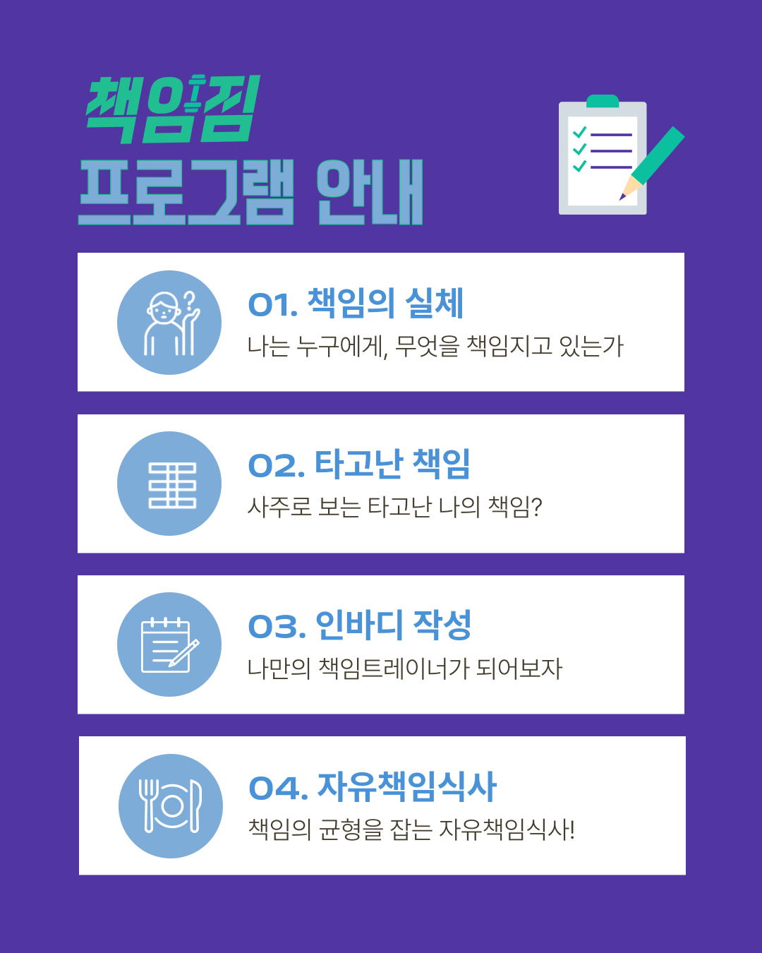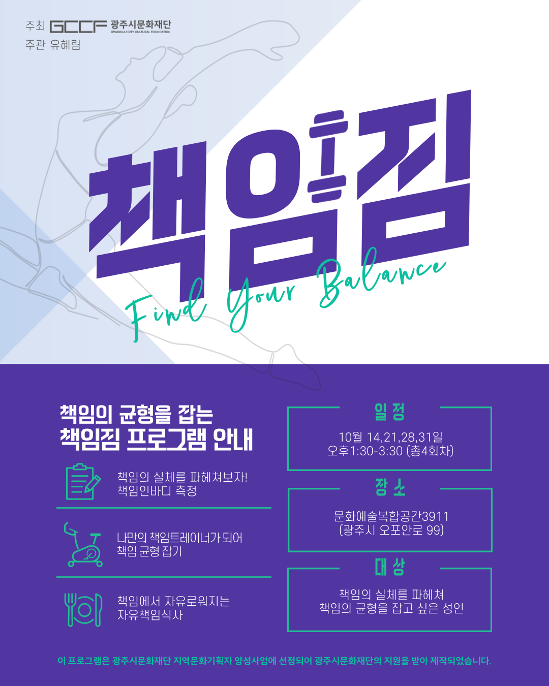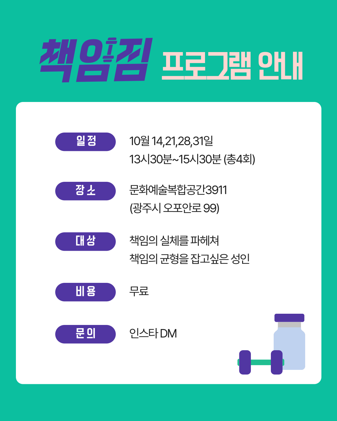 [광주시문화재단 2025 지역문화기획자 양성사업] 참여자가 직접 기획한 프로그램입니다. 💪책임짐(책임GYM) ❣️프로그램 정보 - 일시 : 2025. 10. 14(화), 21(화), 28(화), 31(금) 13:30-15:30 / 총4회차 - 장소 : 문화예술복합공간3911 (광주시 오포안로 99) - 대상 : 책임의 실체를 파헤쳐 책임의 균형을 잡고 싶은 성인 - 신청 : 하단의 인스타그램 DM 문의