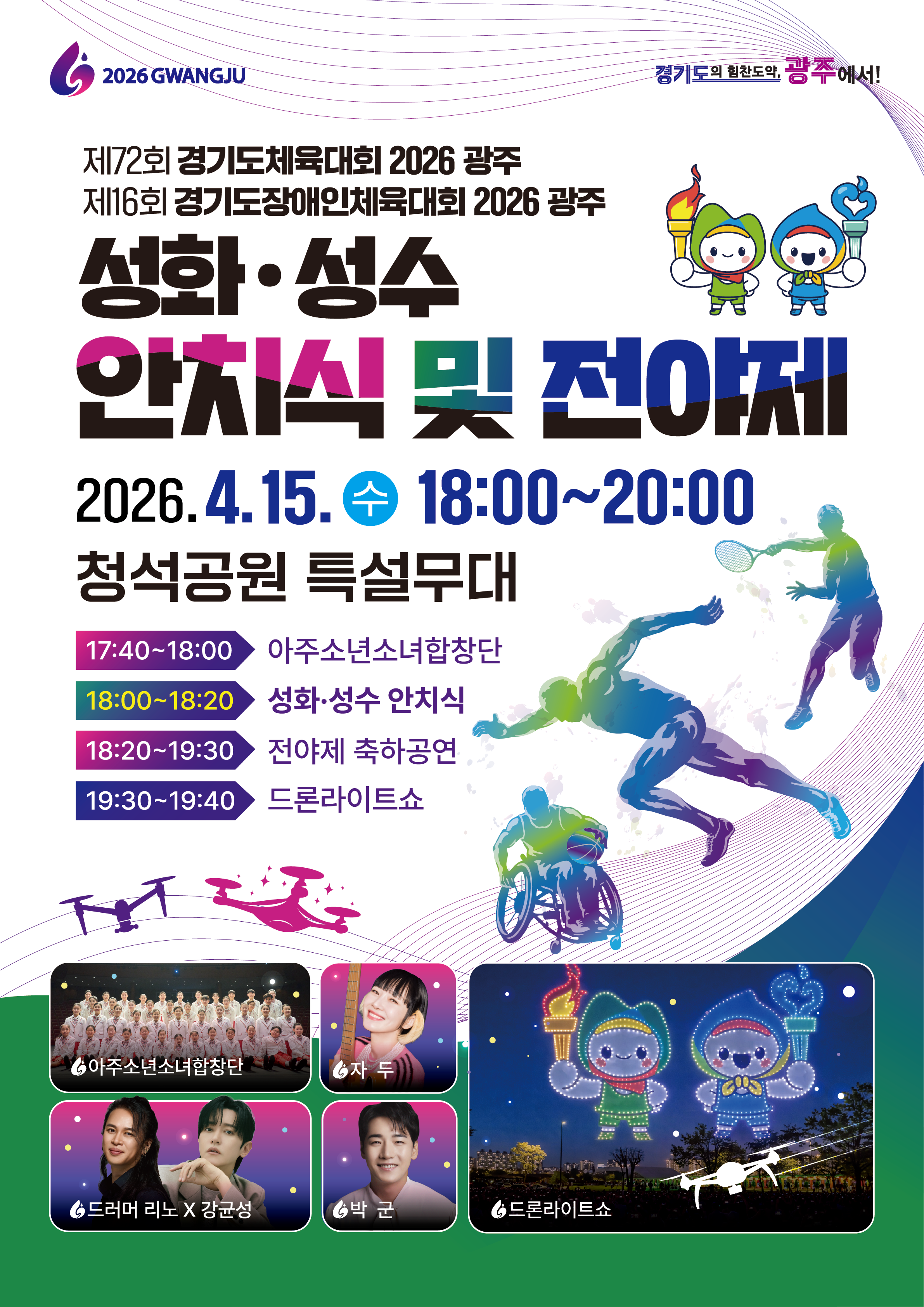 일반소식 2026-03-30 10:41 「제72회 경기도체육대회 및 제16회 경기도장애인체육대회 2026 광주」 성화·성수의 안치식 및 전야제 조회수37 이전 한국문화예술교육진흥원 2026 생활밀착형 문화예술교육 지원사업 '가가호호' 예술가 제안서 등록 안내 다음 「제72회 경기도체육대회 및 제16회 경기도장애인체육대회 2026 광주」 개최 목록