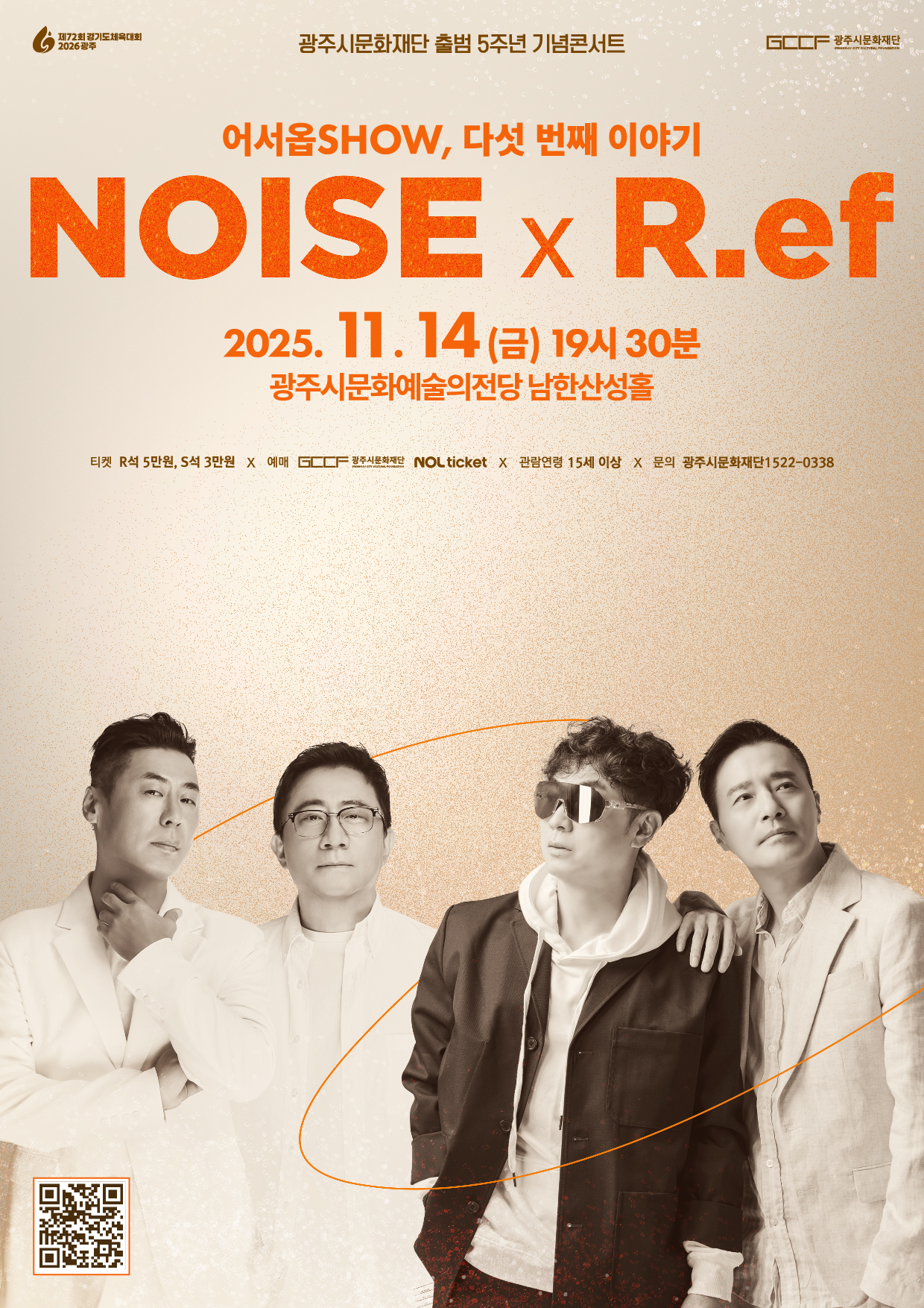 ○ (재)광주시문화재단(대표이사 오세영)은 광주시문화재단 출범 5주년을 맞아 오는 11월 14일(금) 19시 30분 광주시문화예술의전당 남한산성홀에서 레전드 아티스트 노이즈(Noise)와 R.ef가 함께하는 특별한 무대 <어서옵SHOW>를 선보인다.