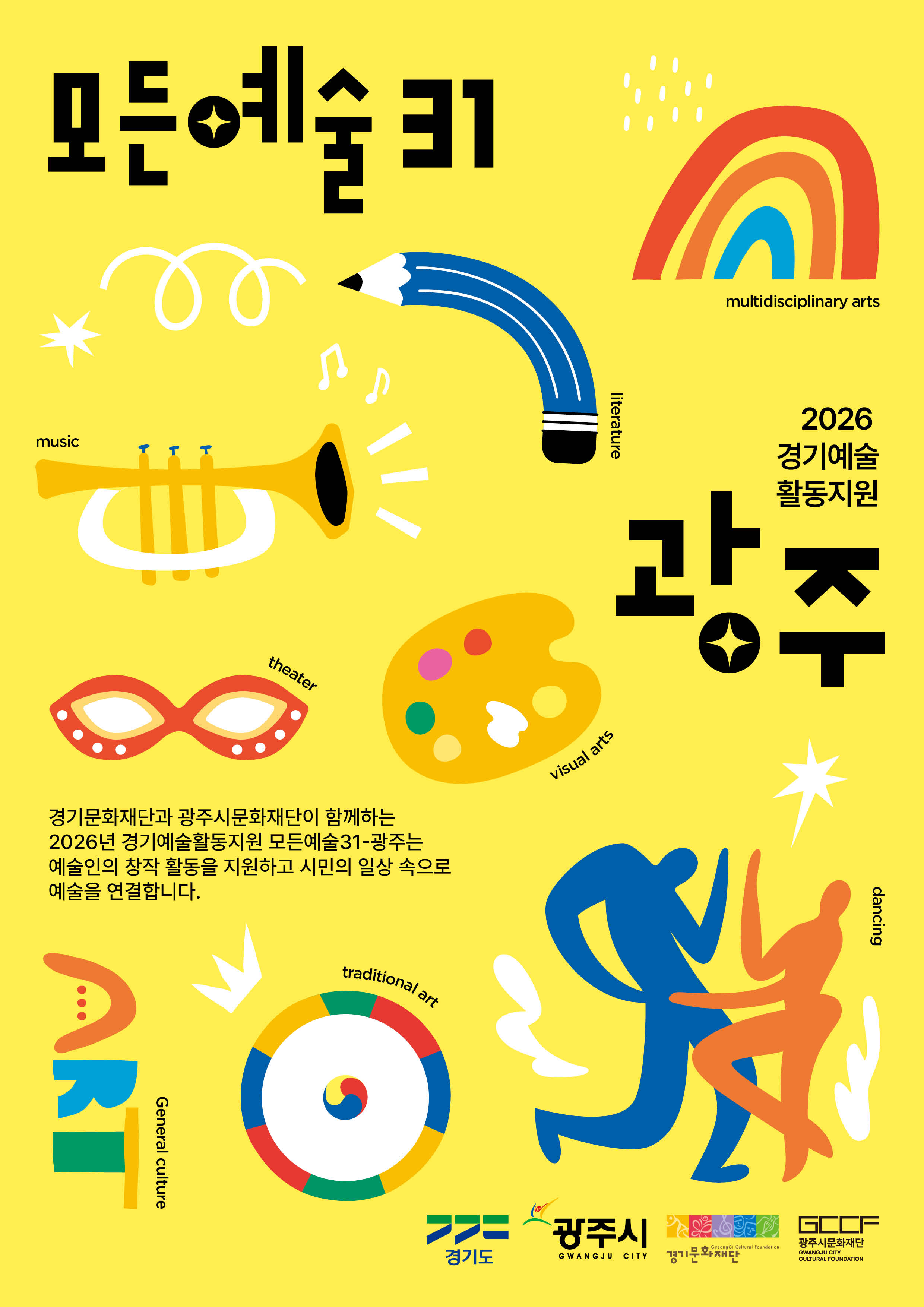 ○ 2026년 경기예술활동지원 <모든예술31-광주>는 경기예술인·단체의 다양한 예술 창작활동을 지원하고 광주시민의 문화예술 경험 확대를 위한 전문예술인 지원 사업이다. 총 56팀이 지원하여 최종 9팀의 예술인(단체)가 선정되었다.
