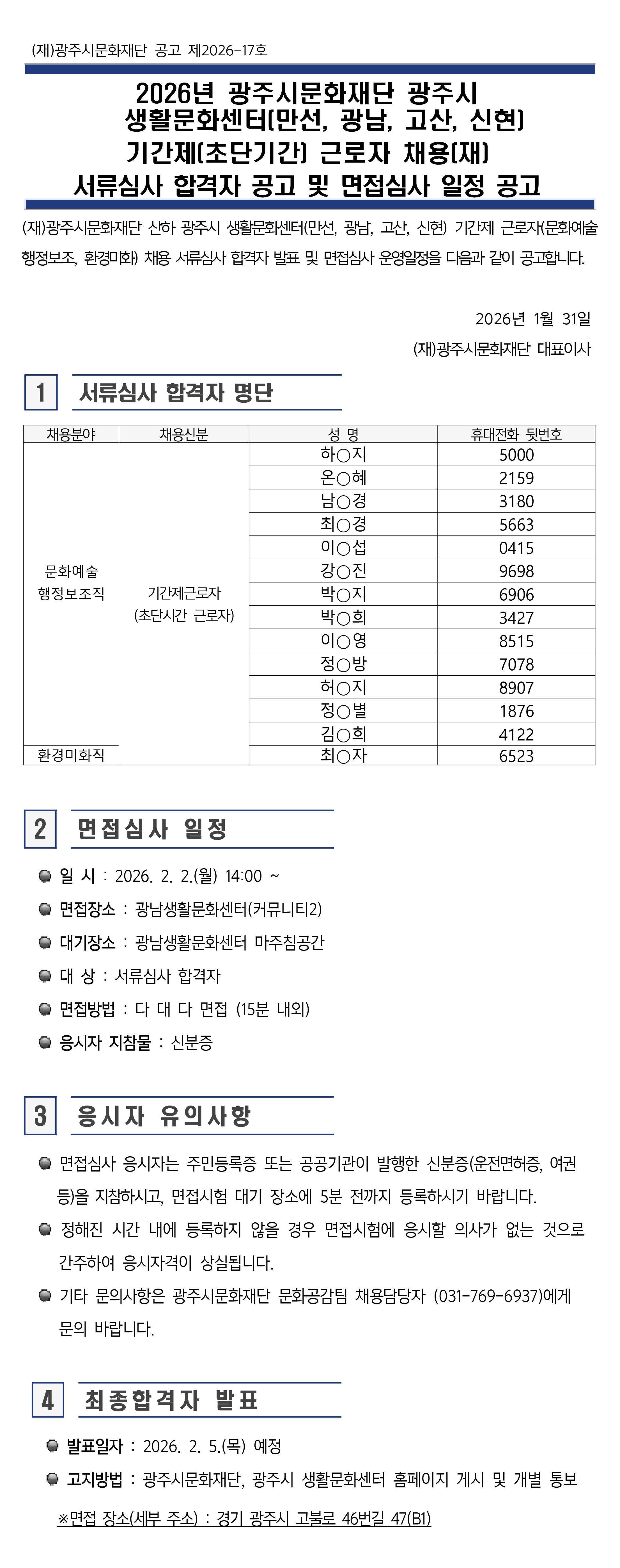 채용공고 2026-02-01 17:58 2026년 광주시문화재단 광주시 생활문화센터(만선, 광남, 고산, 신현) 기간제(초단기간) 근로자 채용(재) 서류심사 합격자 공고 및 면접심사 일정 공고 조회수26 이전 2026년 광주시 생활문화센터(만선, 광남, 고산, 신현) 기간제(초단시간) 근로자 채용 [재]공고 다음 다음글이 없습니다. 목록
