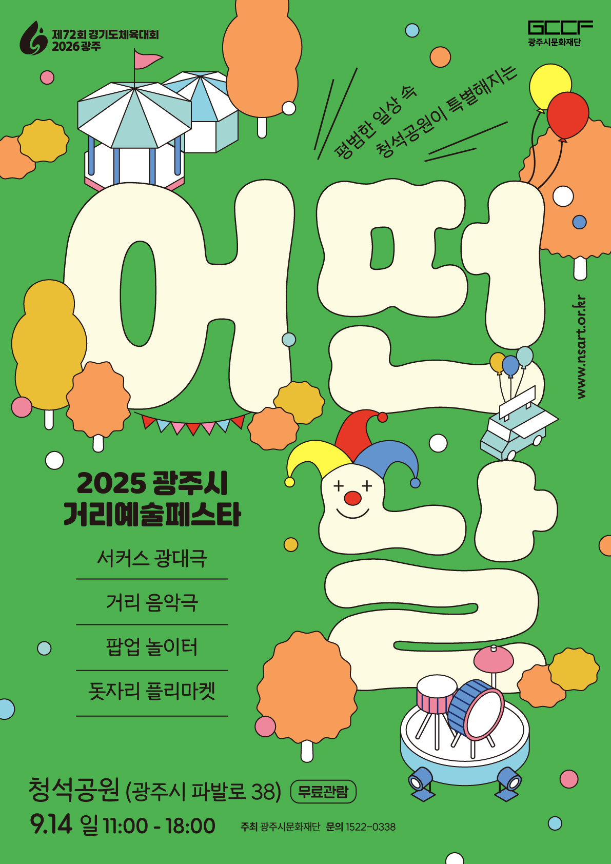 축제·행사안내 구분 구분 축제 행사 기타 검색 [기타] (14시 공연) 2025 경기아트센터 공동기획공연 동화오페라 <피노키오의 모험> 신청접수2025-11-10(월) 14:00 ~ 2025-11-21(금) 17:00 신청마감 [기타] (11시 공연) 2025 경기아트센터 공동기획공연 동화오페라 <피노키오의 모험> 신청접수2025-11-10(월) 14:00 ~ 2025-11-21(금) 17:00 신청마감 [행사] 마당놀이 뺑파전 & 줄타기 <뺑파의 웃음, 줄 위의 흥> 신청접수2025-10-27(월) 16:50 ~ 2025-11-02(일) 23:55 신청마감 [기타] 2026-27 경기도 종합체육대회 광주시 선수단 응원 공연 CHEER UP! <웅산 콘서트> 신청접수2025-10-21(화) 14:00 ~ 2025-11-07(금) 17:00 신청마감 [기타] 2025 경기아트센터 공동기획공연 <한·중·일 MUSIC FESTIVAL> ★ 현장 예매 가능 ★ 신청접수2025-09-30(화) 14:00 ~ 2025-10-19(일) 17:00 비고2025 경기아트센터 공동기획공연 <한·중·일 MUSIC FESTIVAL> 신청마감 [기타] 2025 경기문화예술교육 광역-기초 협력형 연수 <좋은예감> ➂ 중견매개자 지원대상문화예술교육 경력 3년 이상 신청접수2025-09-22(월) 09:00 ~ 2025-10-23(목) 17:00 신청마감 [기타] 2025 경기문화예술교육 광역-기초 협력형 연수 <좋은예감> ➁ 신진매개자 지원대상문화예술교육 경력 3년 미만 신청접수2025-09-22(월) 09:00 ~ 2025-10-23(목) 17:00 신청마감 [기타] 2025 경기문화예술교육 광역-기초 협력형 연수 <좋은예감> ➀ 예비매개자 지원대상예술전공대학생 및 문화예술교육에 관심 있는 청년 등 신청접수2025-09-22(월) 09:00 ~ 2025-10-23(목) 17:00 신청마감 [행사] 광주시문화재단 찾아가는 영화관<오! 헐리우드> 8~10회차 지원대상광주시민 누구나 (상세페이지 상단 '관람 예약 바로 가기' 클릭 신청) 신청접수2025-08-28(목) 18:09 ~ 2025-09-25(목) 23:30 신청마감 [행사] 돗자리 플리마켓 in 거리예술페스타 <어떤날> 신청접수2025-09-01(월) 14:00 ~ 2025-09-01(월) 23:20 비고돗자리 플리마켓 in 거리예술페스타 <어떤날> 신청마감 이전 1페이지로 이동1/923456789다음 2페이지로 이동