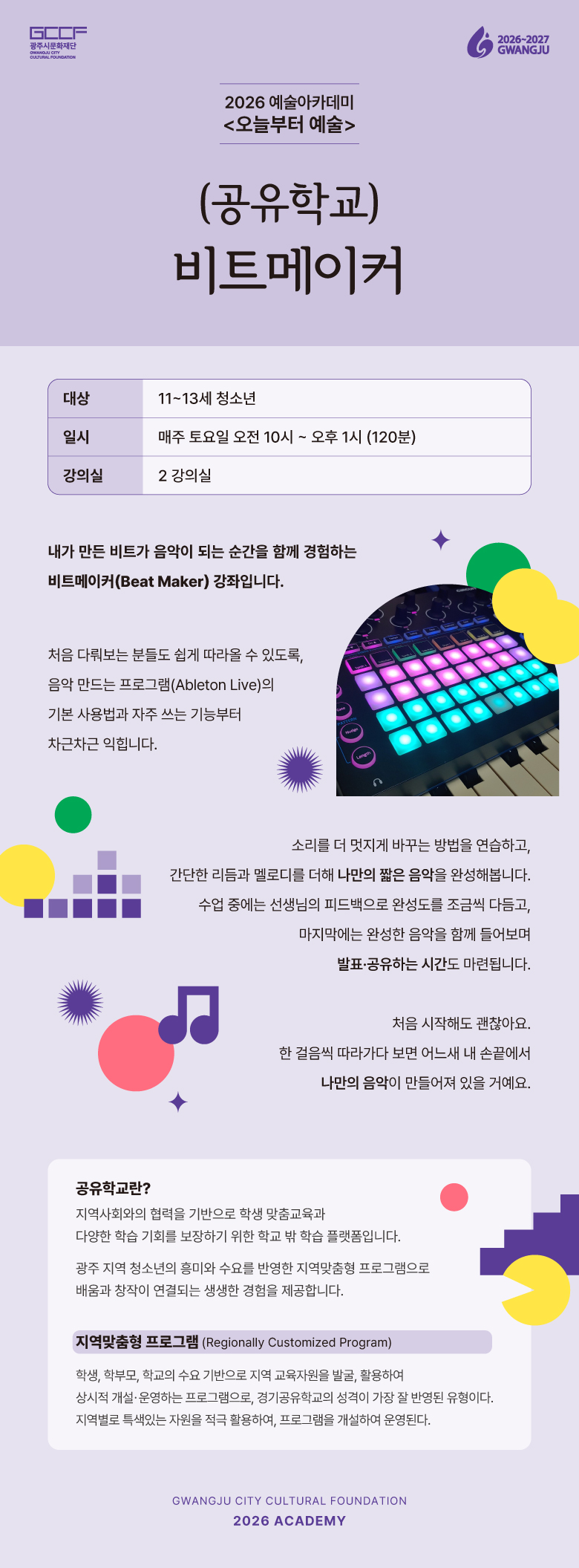 광주 지역 청소년의 흥미와 수료를 반영한 지역맞춤형 프로그램으로광주하남교육지원청과 광주시문화재단이 공동으로 운영합니다.