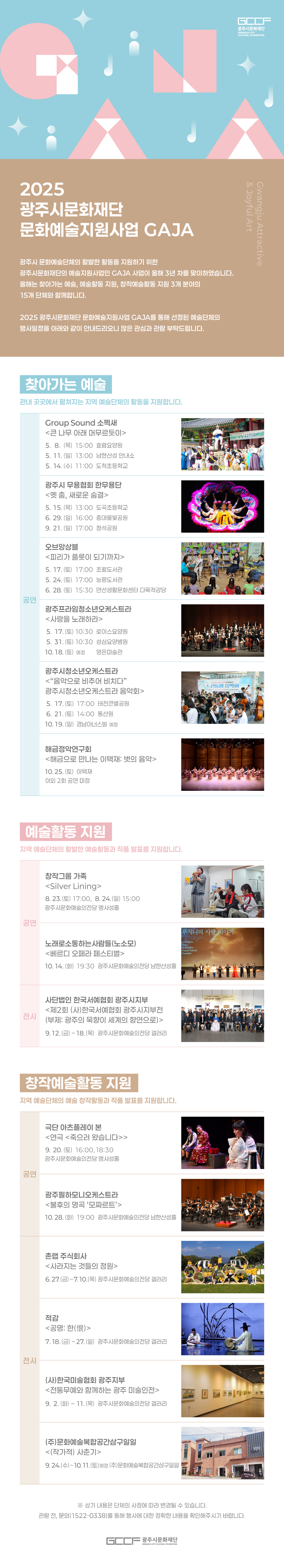 공연·전시안내 기획기타공연/전시 2025년 광주시문화재단 문화예술지원사업 GAJA 선정단체 행사일정 안내 일자 2025-05-08(목) ~ 2025-10-28(화) 시간단체별 상이 장소단체별 상이 주최광주시문화재단 주관2025 광주시문화재단 문화예술지원사업 GAJA 선정단체 공연상세 정보 유의사항 공연상세 정보 유의사항 목록