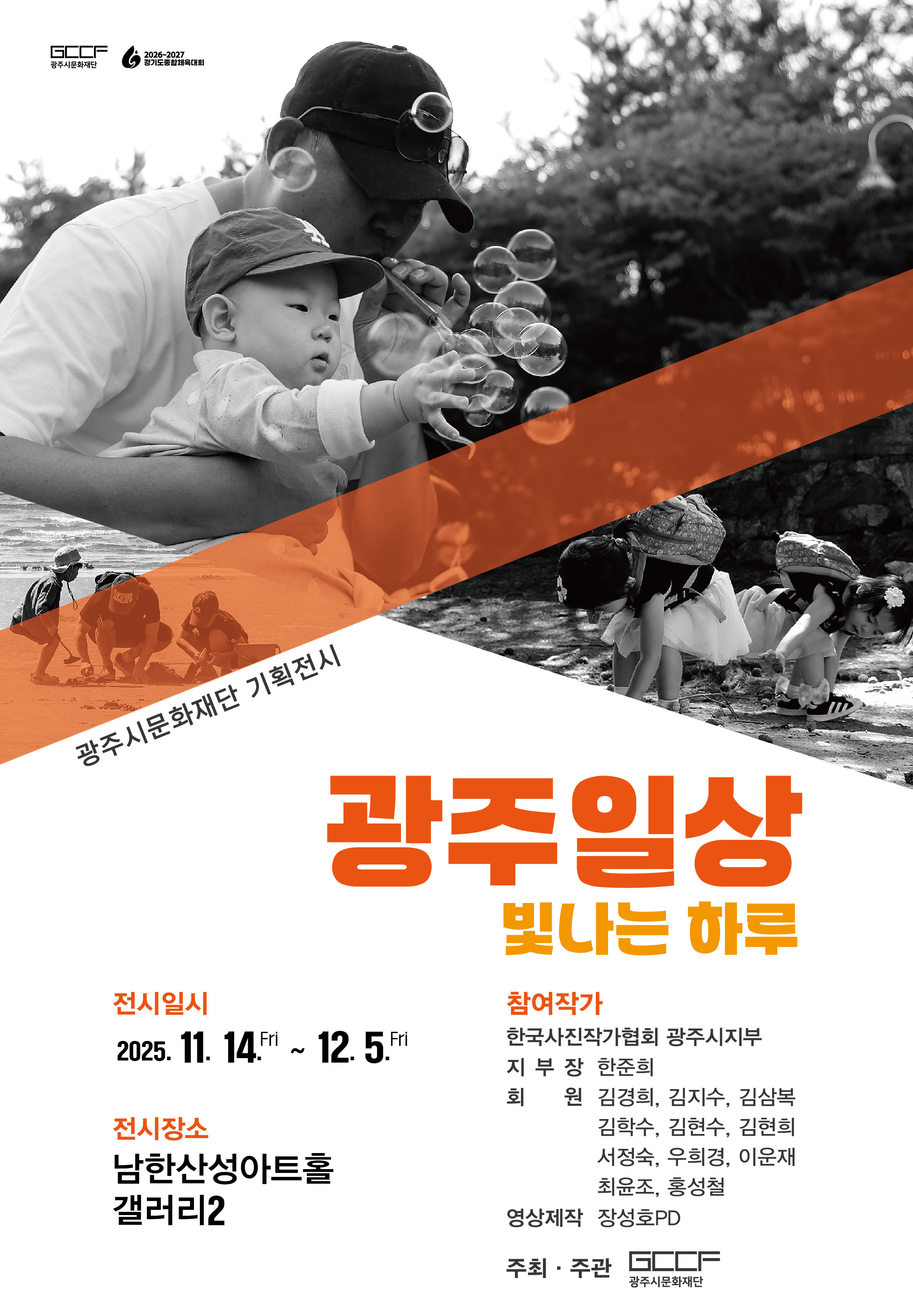 공연·전시안내 기획전시 광주시문화재단 기획전시 <광주일상 빛나는 하루> 일자 2025-11-14(금) ~ 2025-12-05(금) 시간09:30 – 17:30, 매주 월요일 휴관 장소광주시문화예술의전당 갤러리 관람연령1522-0338 주최광주시문화재단 주관광주시문화재단 공연상세 정보 유의사항 360˚ 파노라마 VR 공연상세 정보 ※ 자세한 내용 : 추후 공지 예정 유의사항 목록