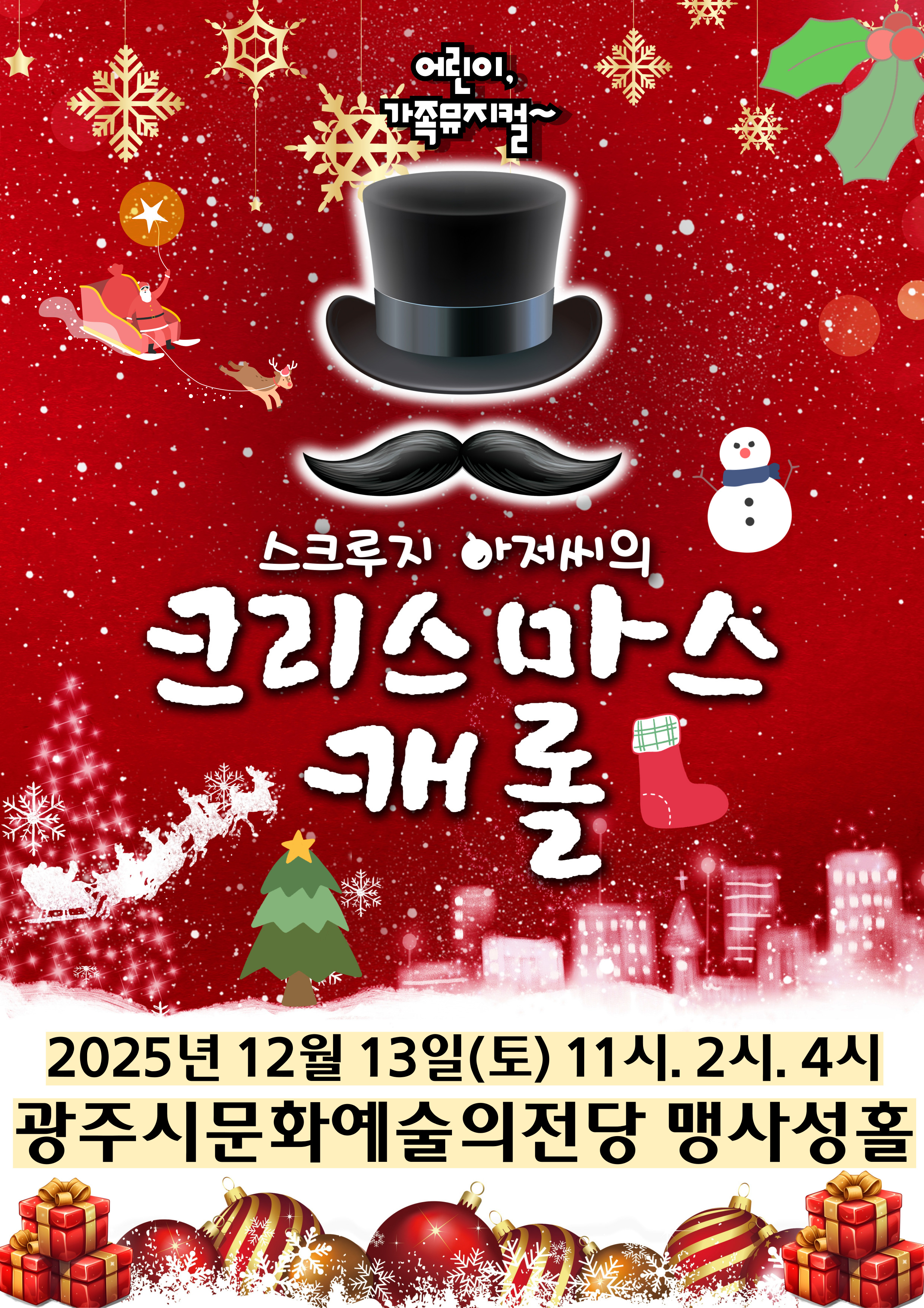 공연·전시안내 대관공연뮤지컬 크리스마스 캐롤 일자 2025-12-13(토) 시간11시, 14시, 16시 장소광주시문화예술의전당 맹사성홀 소요시간55분(인터미션 없음) 티켓40,000원 관람연령전체관람가 주최극단 가람 문의010-2284-4842 공연상세 정보 유의사항 좌석배치도 360˚ 파노라마 VR 공연상세 정보 유의사항 목록