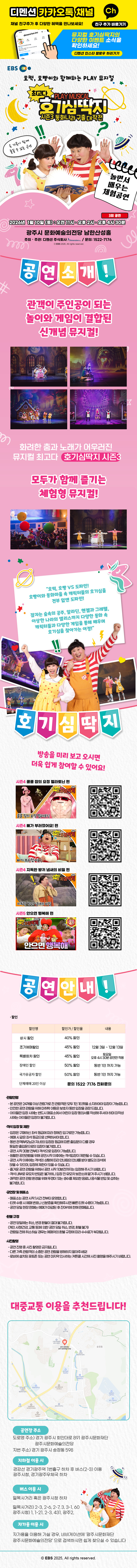 공연·전시안내 대관공연뮤지컬 뮤지컬 최고다 호기심딱지 시즌3 <동화나라 구출 대작전> - 경기광주 일자 2026-01-10(토) 시간11:00 / 14:00 / 16:30 장소광주시문화예술의전당 남한산성홀 소요시간85분 티켓66,000원 관람연령24개월 이상 주최(주) 디멘션 주관(주) 디멘션 문의1522-7176 공연상세 정보 유의사항 좌석배치도 360˚ 파노라마 VR 공연상세 정보 유의사항 목록